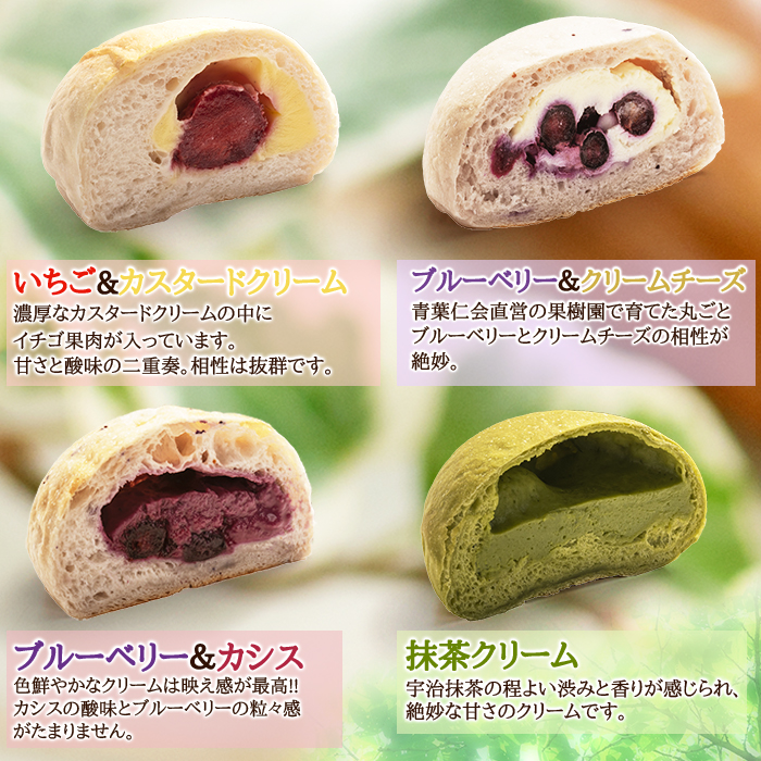 ■内容量:冷やしクリームパン10個(冷やしブルーベリー&クリームチーズ・冷やしクーベルダークチョコ&チョコ・冷やしいちご&カスタードクリーム・冷やし角切りリンゴ・冷やしブルーベリー&カシス・冷やしチョコ&バナナ・冷やし抹茶クリーム・冷やしいちごミルク・冷やしチョコクリーム・冷やしカスタードクリーム×各1個)