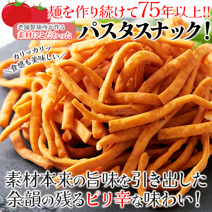 老舗製麺所が作る素材にこだわったパスタスナック☆余韻に残るピリ辛な味わいです!!