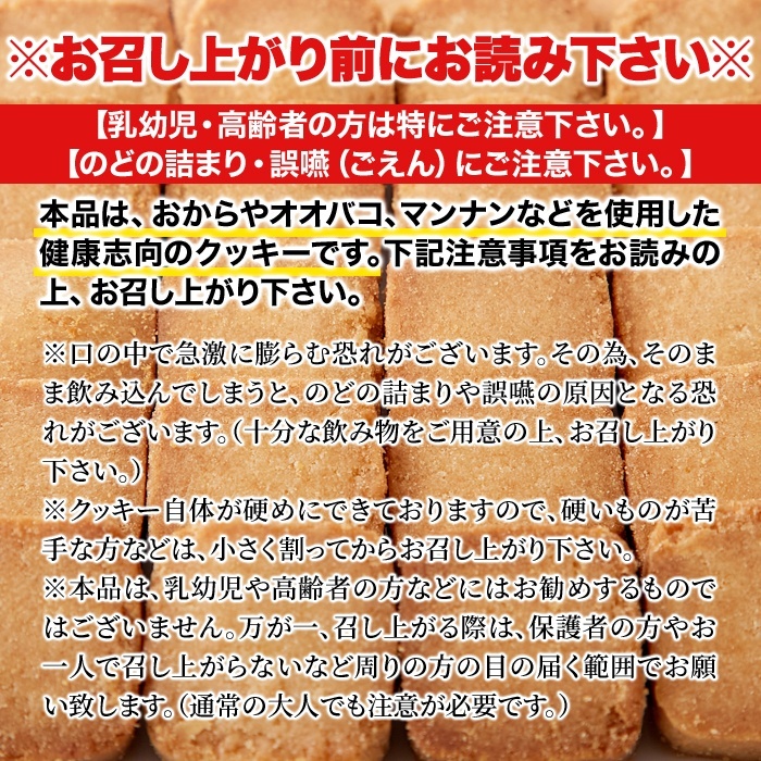 本品は、おからやオオバコ、こんにゃくなどを使用した健康志向のクッキーです。