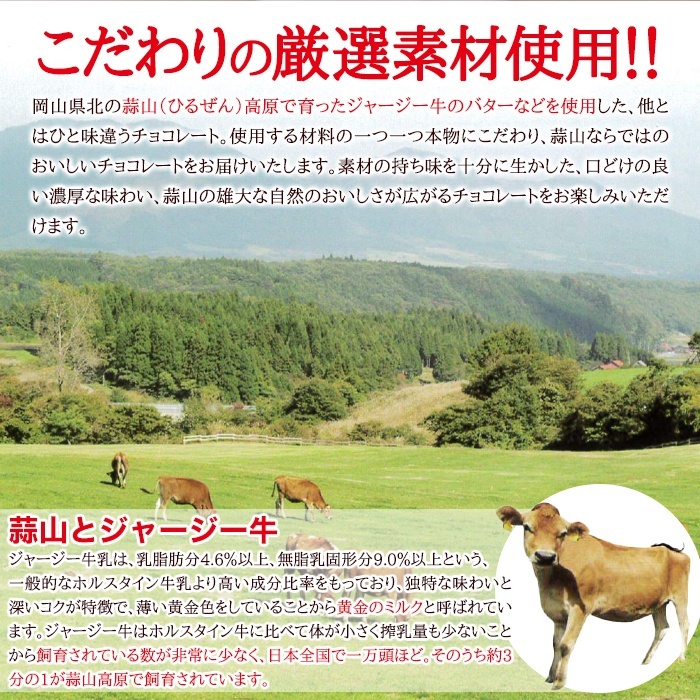 蒜山高原のジャージーバターを使用したこだわりのチョコレート。たっぷり300g入りでお届けします。