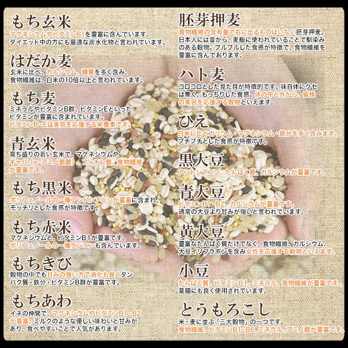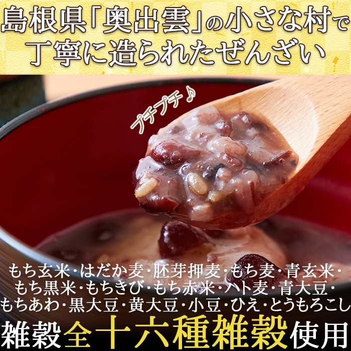 ■原材料名:餅米(島根県産)、砂糖(甜菜)、小豆(島根県産)、十六種雑穀ミックス(もち玄米、はだか麦、胚芽押麦、もち麦、青玄米、もち黒米、もちきび、もち赤米、ハト麦、青大豆、もちあわ、黒大豆、黄大豆、小豆、ひえ、とうもろこし)、食塩