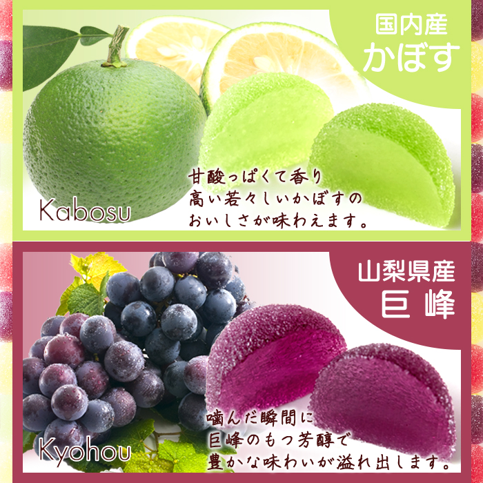 ■原材料名:砂糖(国内製造)、水飴、ぶどう糖、巨峰果汁、カボス果汁、パイン果汁、イチゴ果汁/糊料(ペクチン)、酸味料、ムラサキイモ色素、クチナシ色素、紅花色素、紅麹色素、紫コーン色素