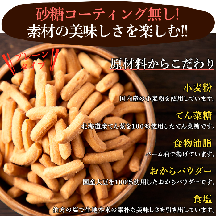 砂糖のコーティング無し!素朴な塩味で素材の甘さが引き立ちます。おからパウダーも使用し、堅めの食感に仕上げました。