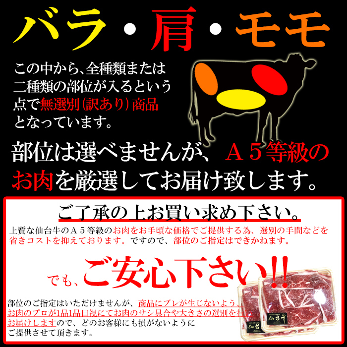 有名ブランド牛「仙台牛」のA5ランク品を部位無選別切り落としでどっさりお得にお届け!!