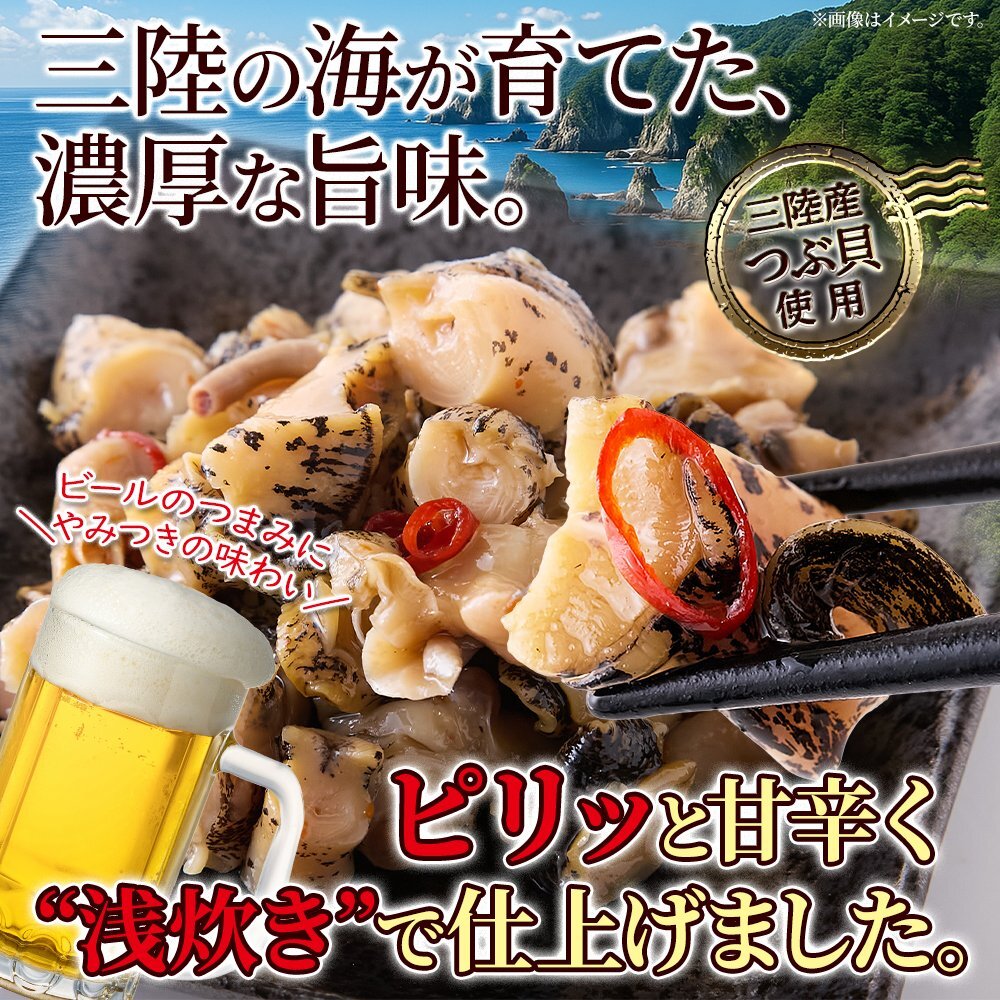 三陸産つぶ貝を甘辛ピリ辛ダレで浅炊き仕立て。 ほどよい歯ごたえと磯の旨味が広がる贅沢な味わい。 おつまみやご飯のお供にぴったりの一品です。
