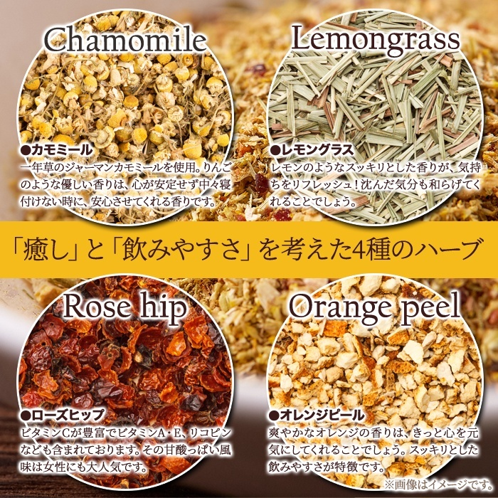 毎日の癒しにリラックスハーブタイムを。「癒し」と「飲みやすさ」を考え、カモミールにレモングラス・ローズヒップ・オレンジピールを加えたオリジナルブレンドティー♪ティーバッグタイプ。